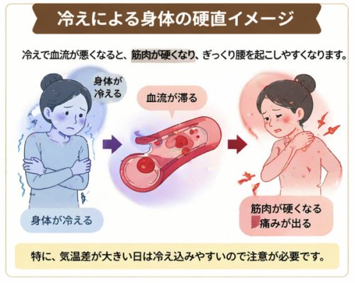 気温差が大きい日は、身体の深部が冷えて筋肉が硬直しやすくなります。