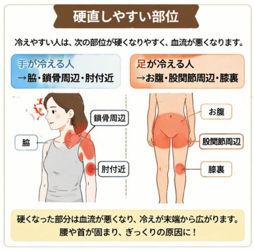 手が冷える人は、脇から鎖骨周辺、肘付近が硬いことが多いです。