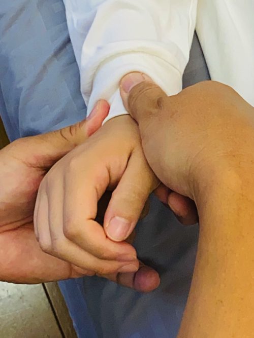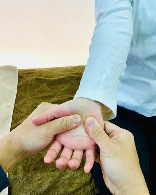 施術は指先から手の屈筋を調え手首、前腕、肘を神経ルートから調整し筋肉の硬直を解きました。