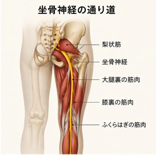 しかし実際には、臀部、股関節、大腿裏、膝裏、ふくらはぎ、足裏まで神経ルート全体を確認する必要があります。