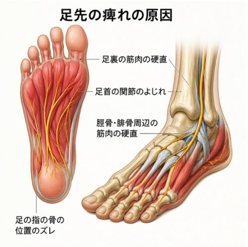 足裏の筋肉が固まることで、足の指の骨の位置まで狂い、足先の痺れや痛みに影響していました。
