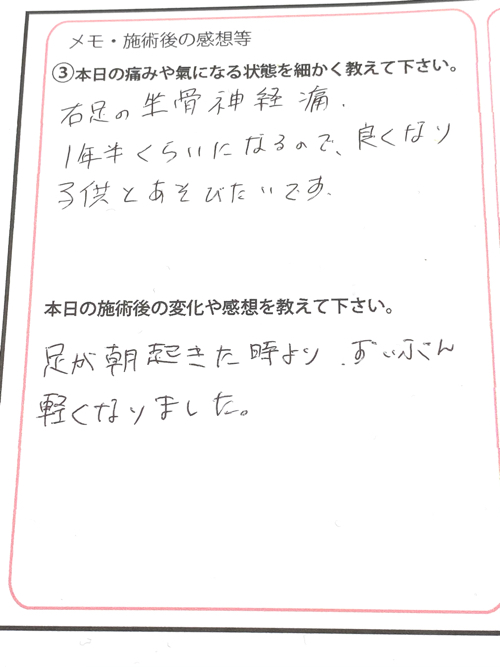下半身が軽くなり、歩きやすくなったと大変喜んでくださいました。